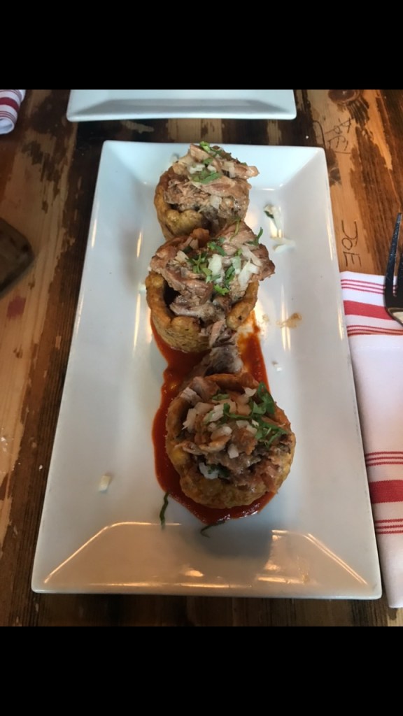 On a slightly more positive note, Alexis and I also decided to order the Roasted Pork and Garlic Mojo Tostones Relleno while at El Sombrero, and I have to say that these were absolutely amazing. It was carnitas style pork, packed with flavor, and spices, topped with some onions and salsa, stuffed in tostones rellenos (essentially deep fried plantain cups, this will be clearer when you see the picture ), and served on top of a spicy, smooth salsa. For me this was the absolute perfect bite. I had never actually had tostones relleno, but I love plantains so I was pretty sure that this was going to be something that I enjoyed. And I of course ordered the pork because I honestly find the Mexican preparation of pork to be one of the most delicious things on this earth. I also find it necessary to talk about the salsa that the tostones relleno were served over. I am unsure of what it was exactly, but I was soaking it up with the fried plantain because it was so delicious. I am a self-proclaimed sauce-girl, so if anyone can tell what it is by the picture, please let me know because I need more of it in my life! 10/10 would recommend ordering these if you do got to El Sombrero.