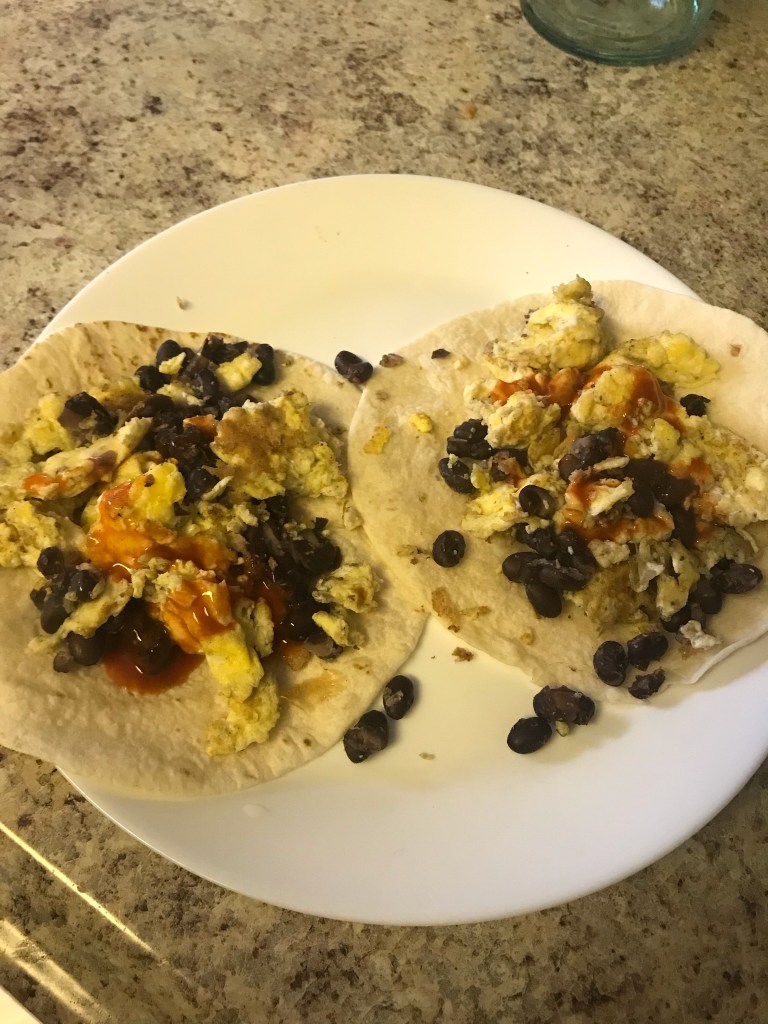 Similarly to just about everyone right now, I am currently trying to adapt to this quarantine-lifestyle. I think that one of the major differences for me has been the food that I have been making. I obviously want to leave my house as little as possible so when I have gone to the grocery store, I try to get things that will last me a while, but will also be delicious. I decided to stock up on eggs and beans because I love a simple egg scramble with beans and hot sauce. But then when I was in the bread aisle, they didn’t really have any loaves so I decided to get a pack of tortillas instead. And that is how my go-to quarantine meal was born.