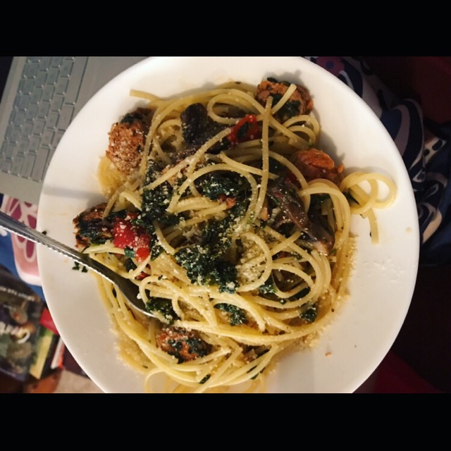 A couple of weeks ago I bought some spicy chicken sausage to put with my vegetables and to throw in with my breakfast tacos. One night, I went to make my breakfast tacos, and I realized… I WAS OUT OF TORTILLAS!! But, I had already started making my sausage, so what was a girl to do? I looked through my refrigerator and freezer to see what I could do to salvage this meal. I had garlic, always a must. I threw that in a pan with some olive oil and let it saute for a minute. I had some mushrooms that I needed to use before they went bad so I tossed those in as well. Then I found some extra frozen spinach in my freezer so I decided to throw that in as well because, I LOVE spinach. Then I saw that I had some canned roasted red peppers, and I thought ooooh yum, pasta! So I added those to the pan and started boiling my water. Once my sausage had cooked fully through, I added that to the pan with my veggies, added the pasta, a little bit of the pasta water, salt, pepper, red pepper flakes, and then topped it off with Parmesan cheese. I don’t want to be dramatic, but it was the best thing that I have ever made and I didn’t even mean to make it! I have probably had it five times since and I 10/10 would recommend.